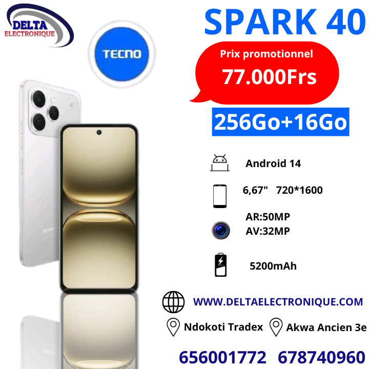 Le Tecno Spark 40 se positionne comme un excellent choix pour les utilisateurs à la recherche d’un smartphone 4G moderne, performant et accessible. Avec des caractéristiques améliorées et une expérience utilisateur optimisée, ce modèle se démarque dans sa gamme. Il est disponible en version 256 Go + 8 Go RAM, avec garantie 24 mois, et inclut une offre exclusive de 45 Go de data Orange offertes pour rester connecté dès l’achat. Une combinaison idéale de puissance, de stockage et de connectivité au meilleur prix sur Delta Électronique .